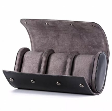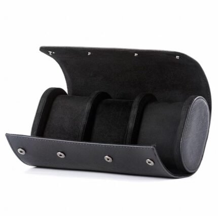 Three-watch travel organizer with firm side walls and a plush interior for added protection. Quick‑snap buttons allow fast open and close, keeping your timepieces secure in transit or at home.